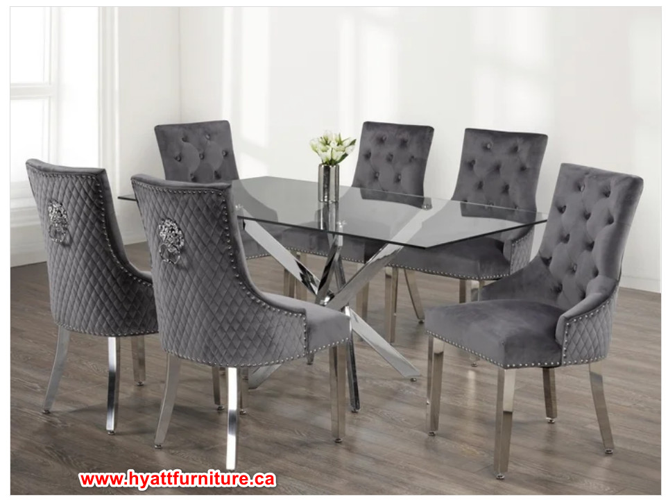 Chairs: Grey Velvet Dining Chair with Lion Knocker, Polished Chrome Frame, Diamond Studded back and Nail Head Details.