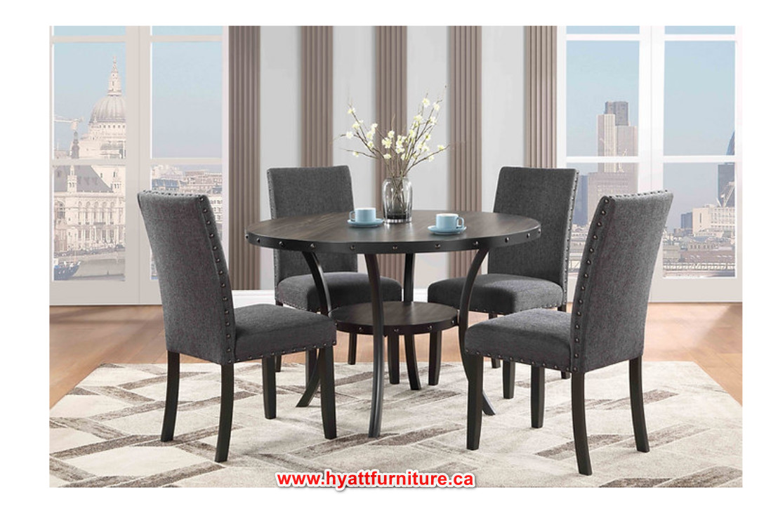 Table: Espresso Rustic Table with Nailhead Trim and Storage Shelf.