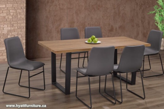 Make an impact in the dining room with this live edge dining set. The 2″ thick, distressed oak veneer table top contrasts perfectly with the thick, black metal legs to create a look you will love to entertain on for years to come. With unique, wrap around legs and cushioned high backs, the dining chairs ensure your dinner parties will last all night in comfort!