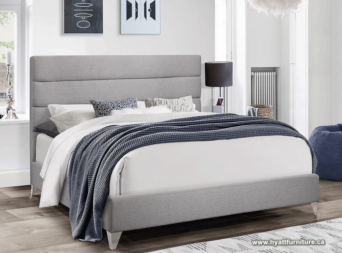 Grey Fabric Bed with Horizontal Deep Tufted Panels and Chrome Legs