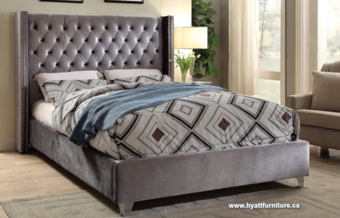 Fabric Wing Bed with Deep Button Tufting and Nailhead Details