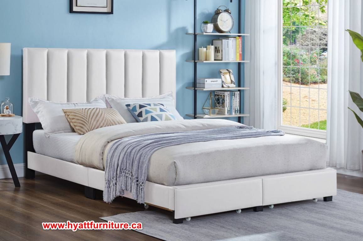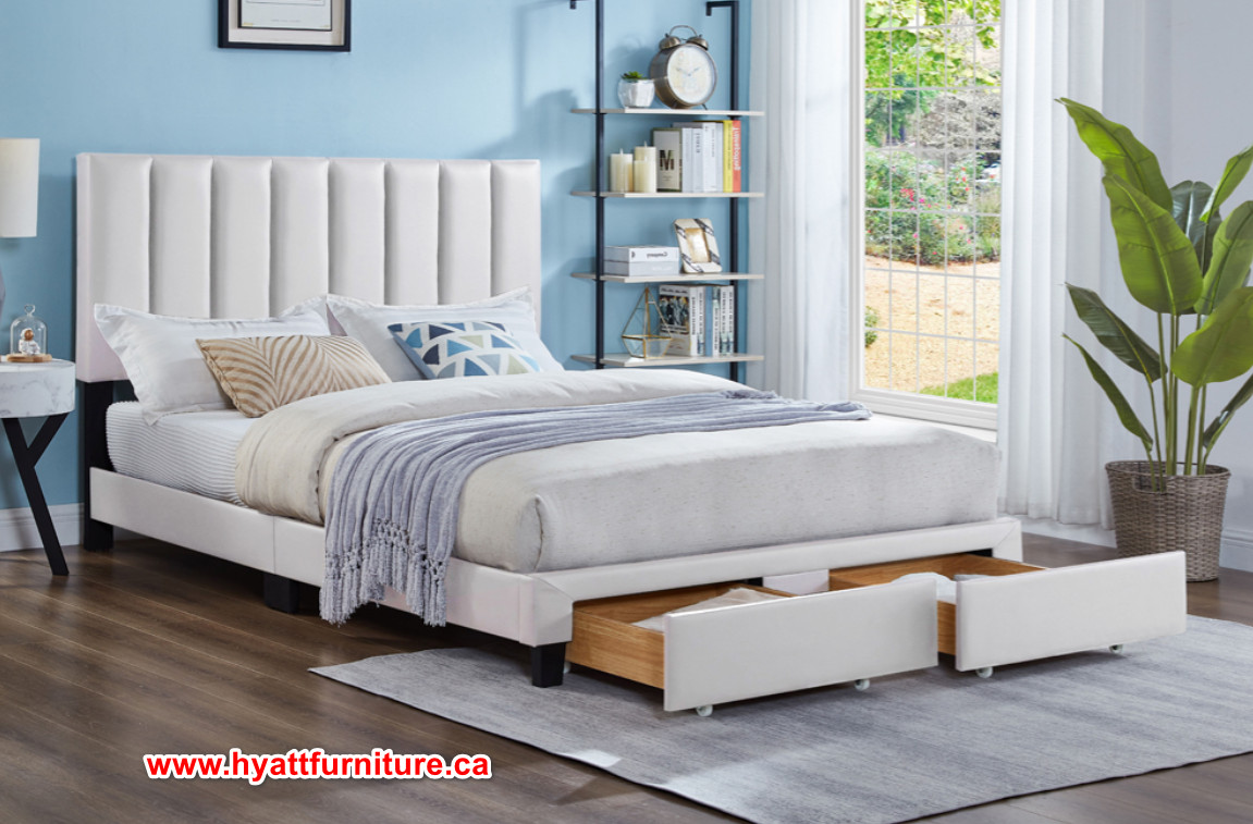 Style and function combine for these contemporary storage platform beds. Panel tufting offers an unique headboard look, headboard is adjustable. Two large front drawers offer plenty of storage space while the soft button tufted, adjustable headboard offers an impressive look. Single bed includes one drawer. Neutral colours and fabrics match most bedroom designs.
