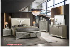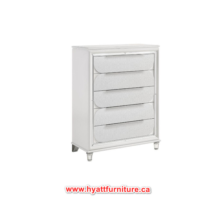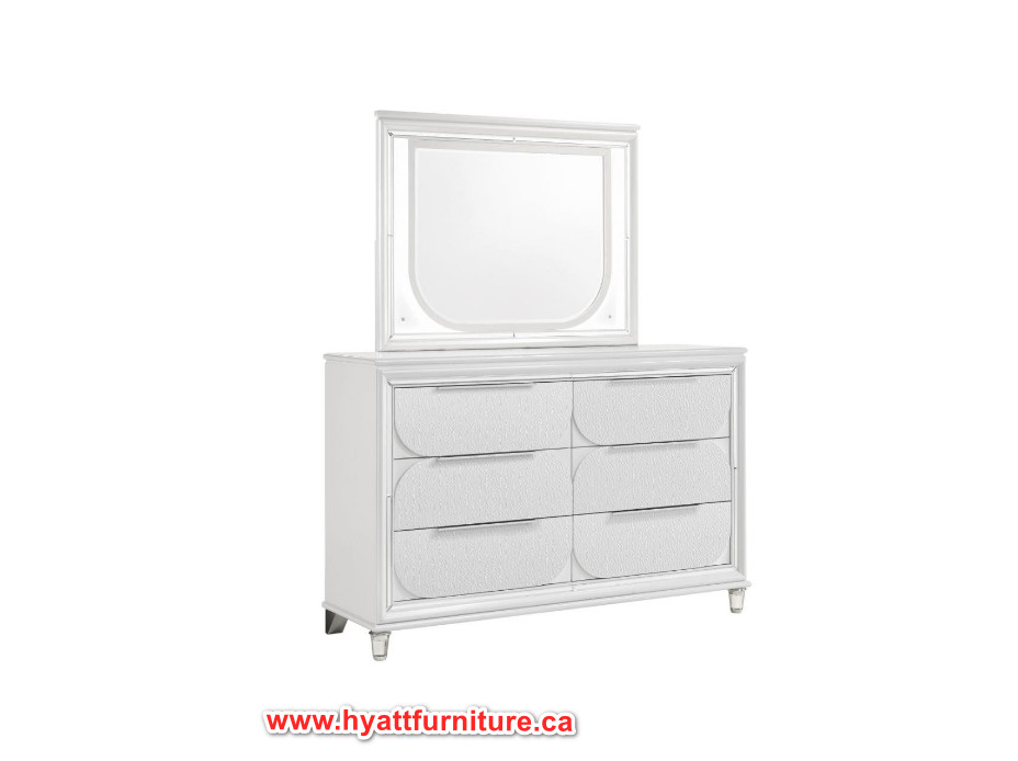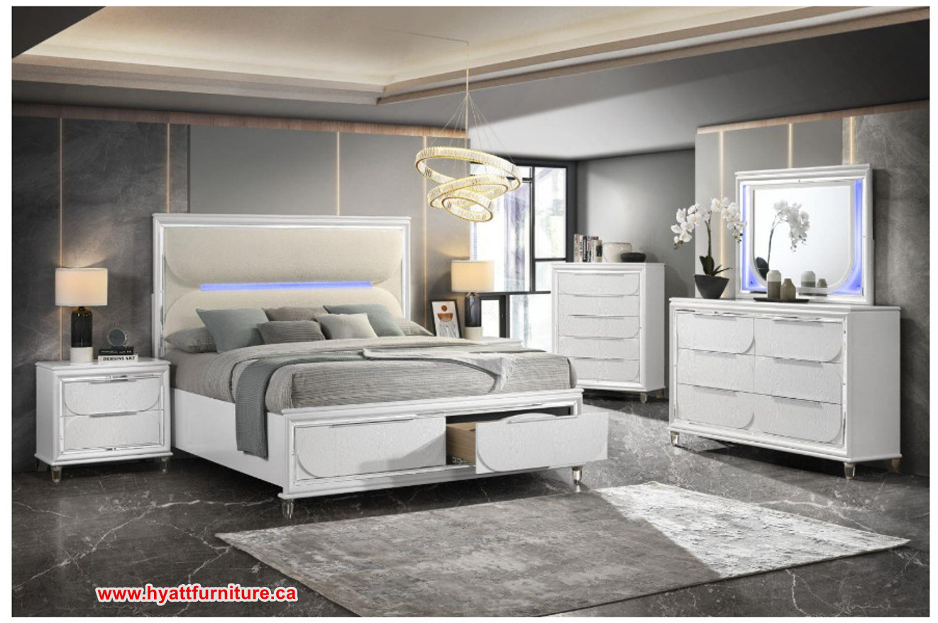 Transform your bedroom into a haven of modern luxury with the Rachel Bedroom Set, which includes a bed, dresser, mirror, nightstand, and chest. Each piece features a harmonious white finish and is designed to complement each other beautifully.