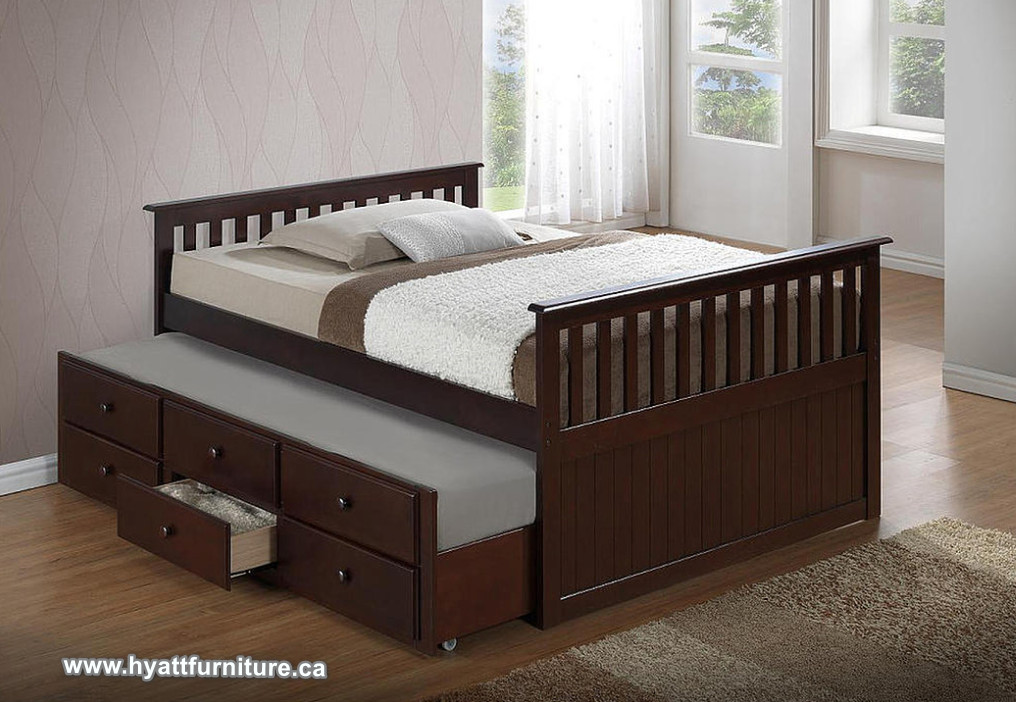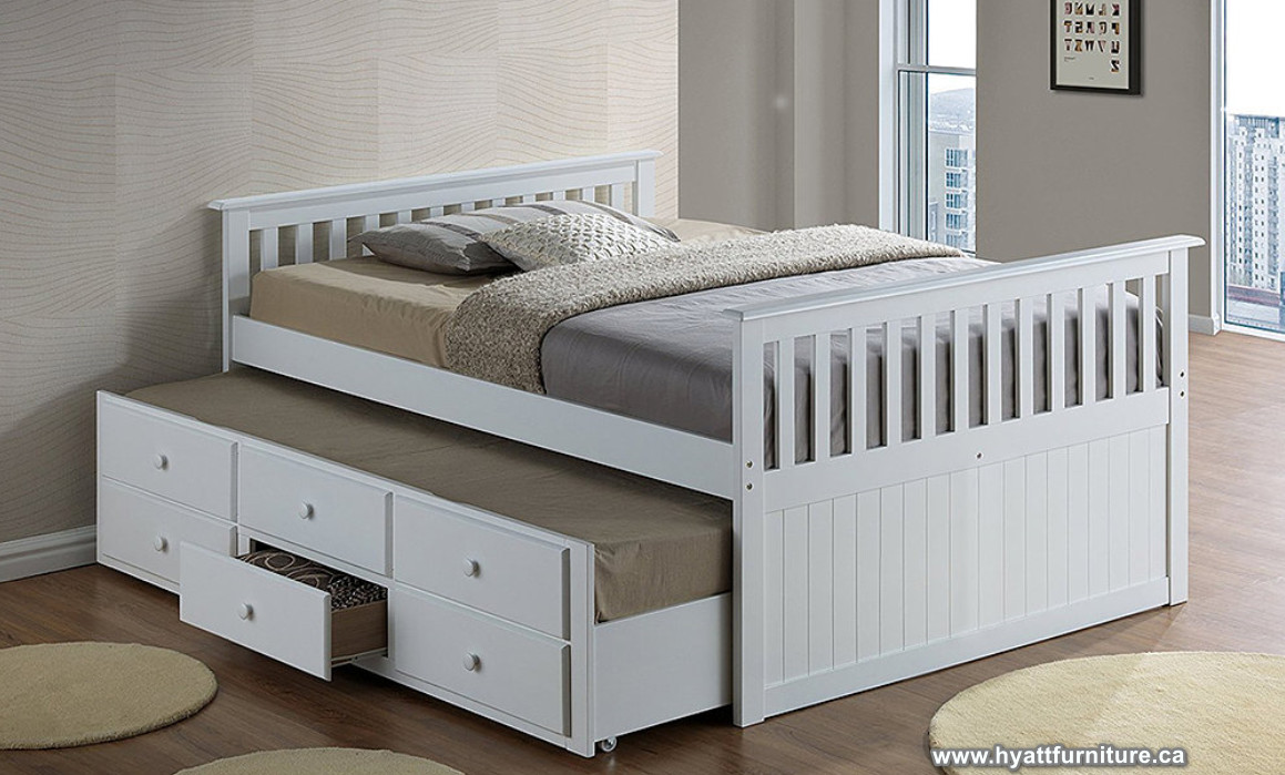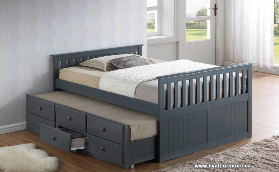 This multi-purpose, Single under Single Captain’s Daybed is a great space saving solution with both storage and a trundle. The solid wood frame offers a sturdy sleeping space, while the side drawer pulls out to reveal both a trundle for an additional mattress, and 3 deep drawers.