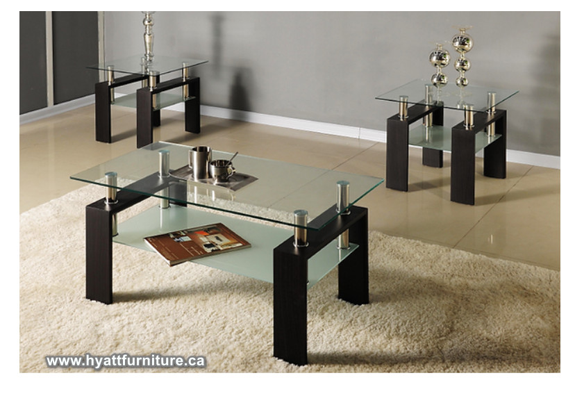 A modern touch to your room with this Coffee table Set featuring a clear glass top, and black legs with a frosted glass magazine shelf.