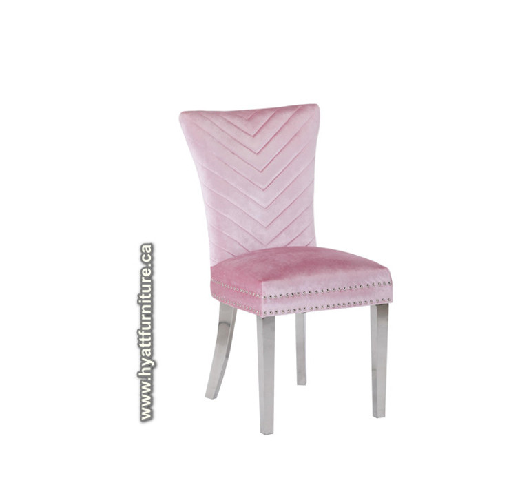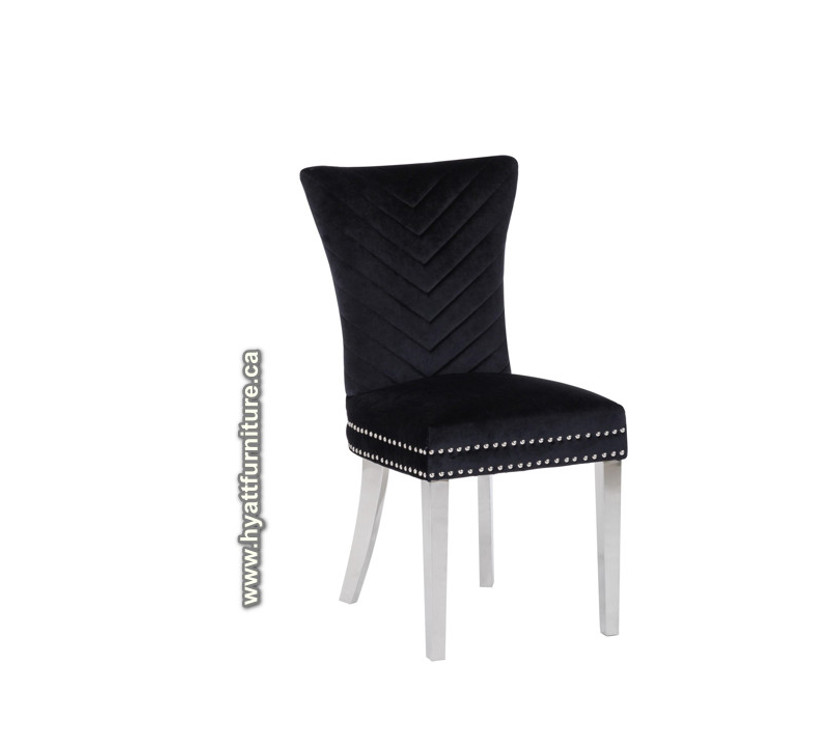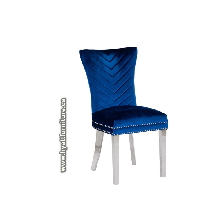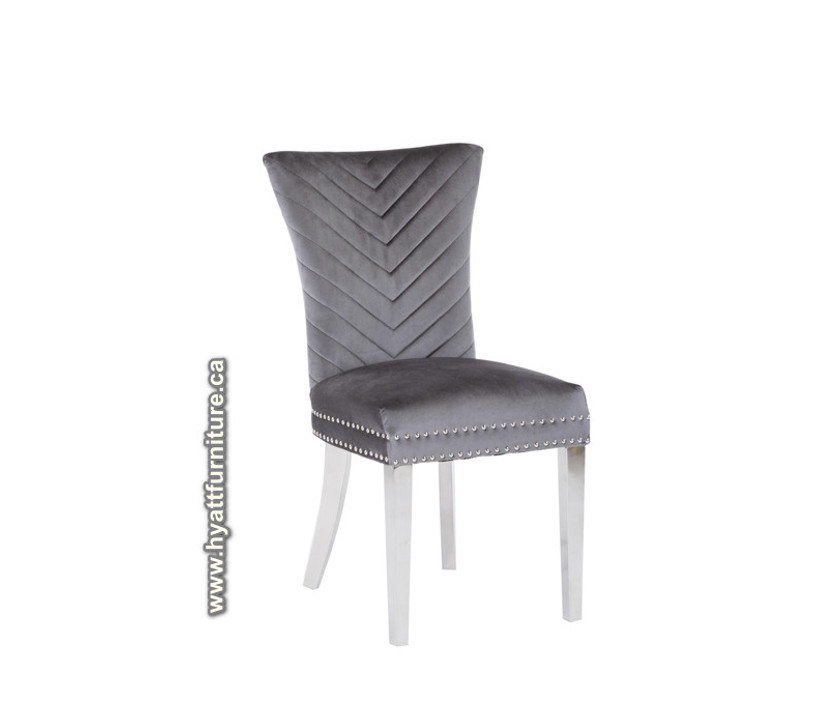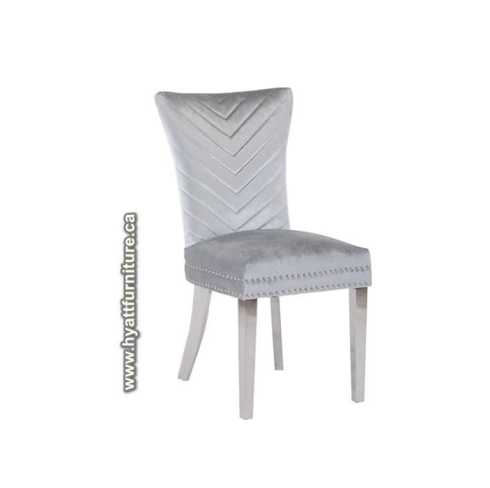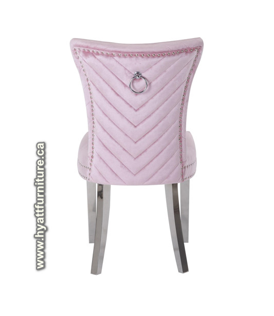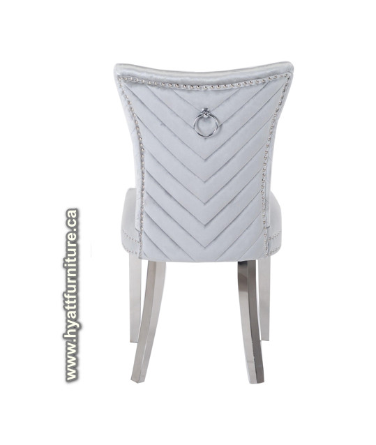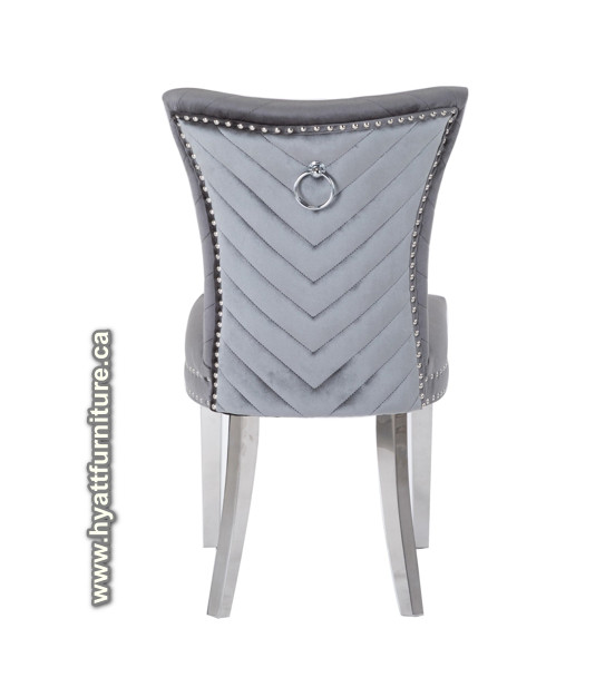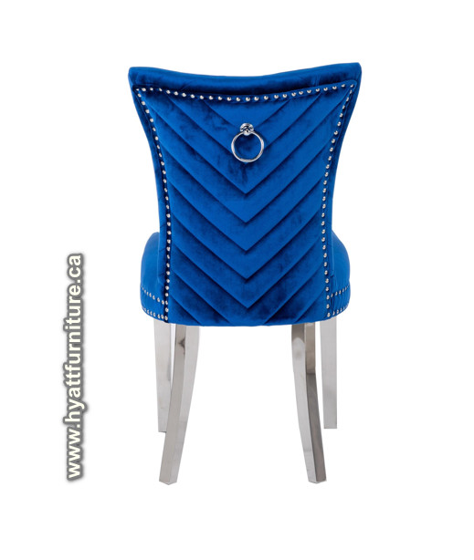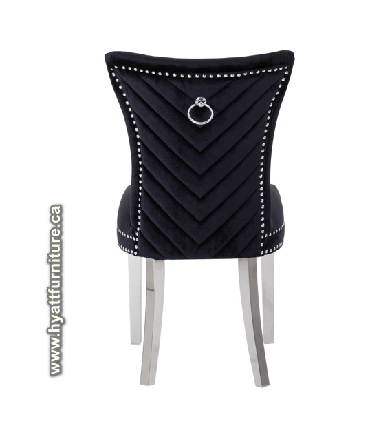 In your choice of Velvet-style fabric, chairs include nailhead trim, deep button tufting, and silver knocker on the back.