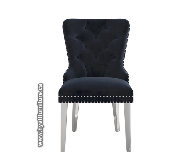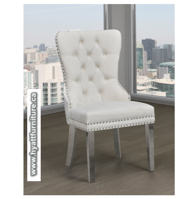 In your choice of Velvet-style fabric, chairs include nailhead trim, deep button tufting, and silver knocker on the back.