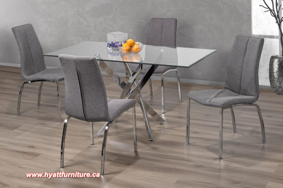 Present a sense of style and sophistication with this stunning dining set. Thick, tempered glass rest upon an unique set of chrome finish legs to create a look your guests will admire through the entire meal. Contemporary dining chairs include grey linen seating with chrome finish metal legs