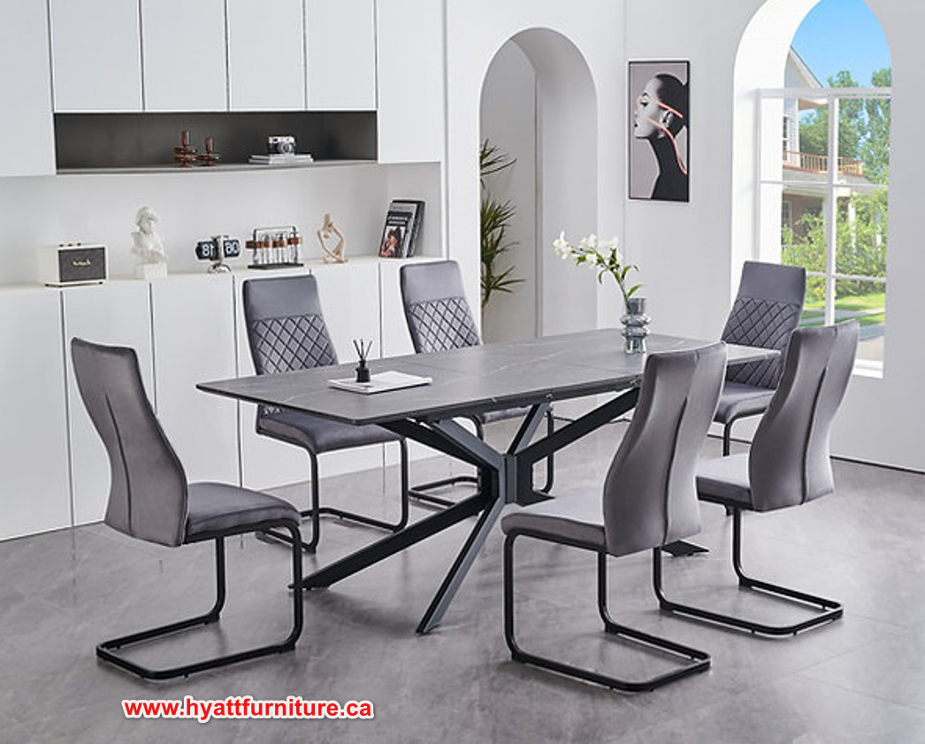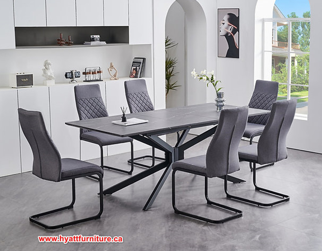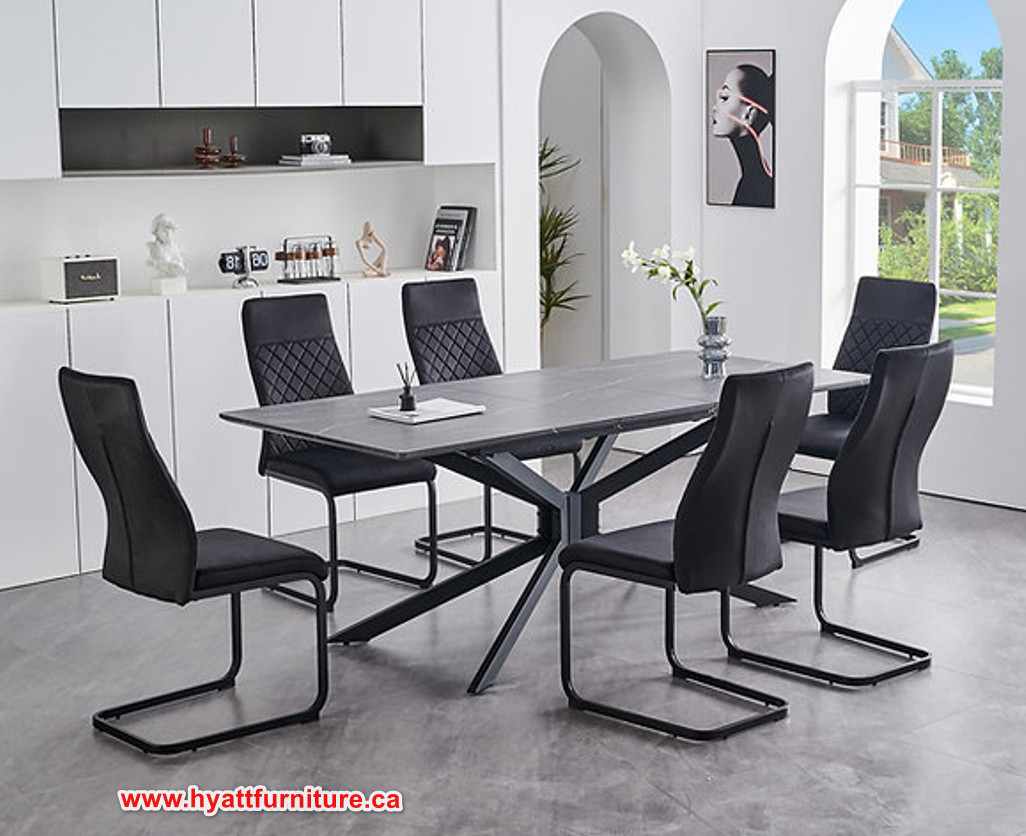 Extension Table: Grey Marble Veneer Top With X-Shape Black Steel Base