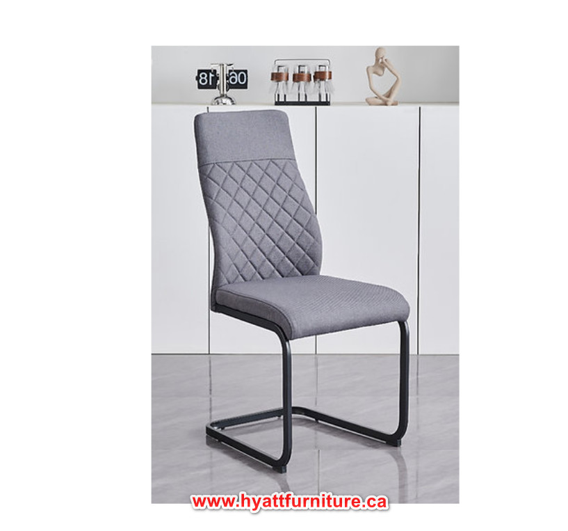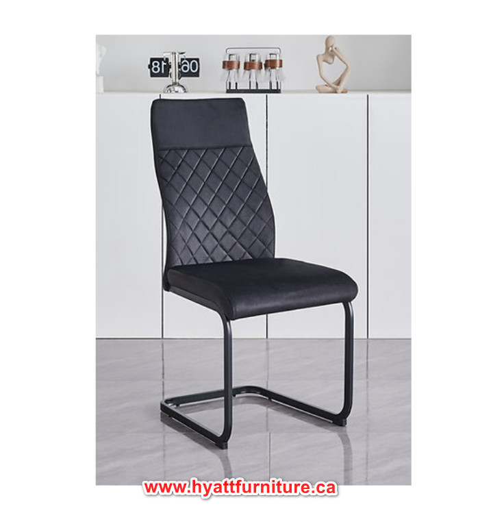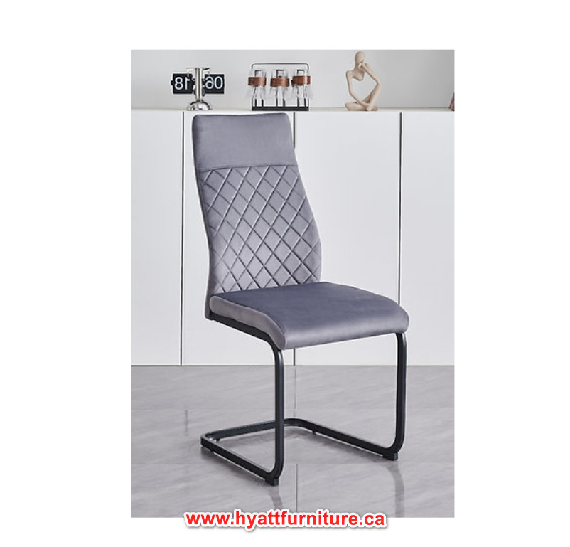 Chairs: Soft Black, Grey Velvet or Grey Linen Fabric with Diamond Stitching Details, C-Shaped Black Steel Base