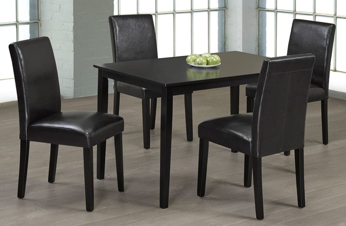 Table- Wood with Cappuccino Finish, Chairs- Wood with Espresso Finish and Espresso Bonded Leather.