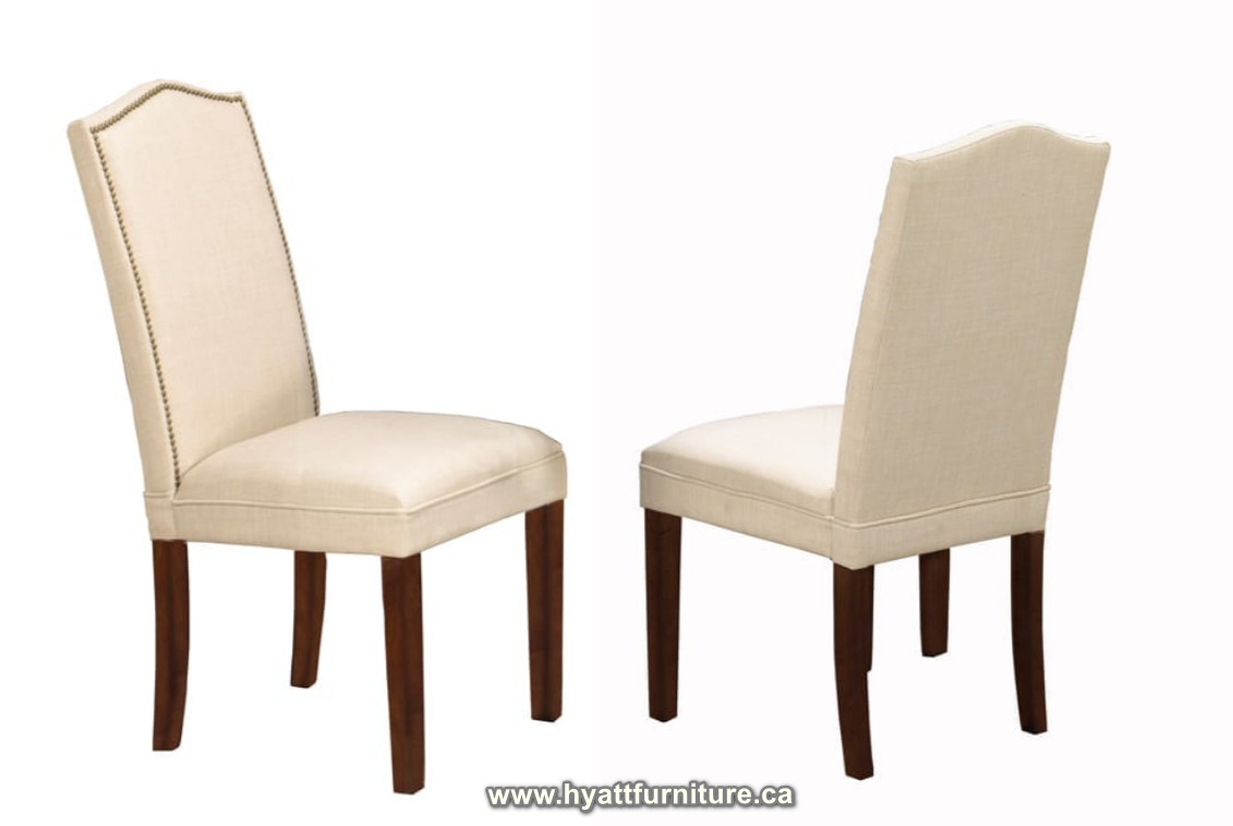 Designed to impress, this dining set adds style and sophistication to any occasion. Table includes live edge design, high gloss table top and pedestal table. Chairs are upholstered in rich, beige linen-style fabric and include nailhead trim.