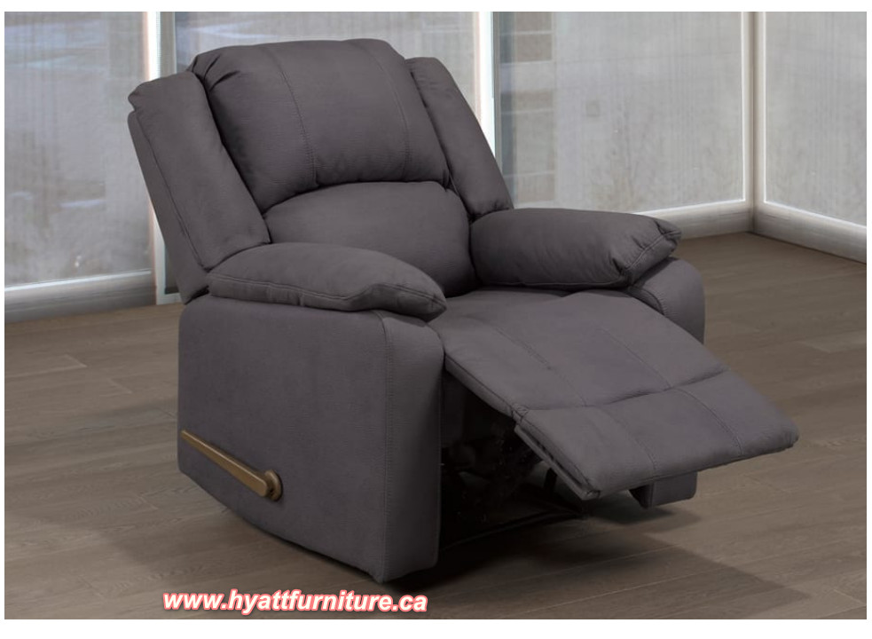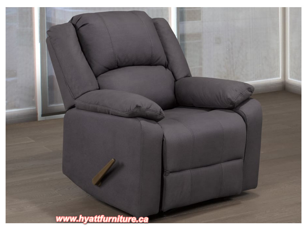 Sink into comfort with this overstuffed, lush cushioned chair. Swivel rocker recliner includes handle for easy pull function and can rotate 360 degrees. Draped in beautiful grey air suede fabric.