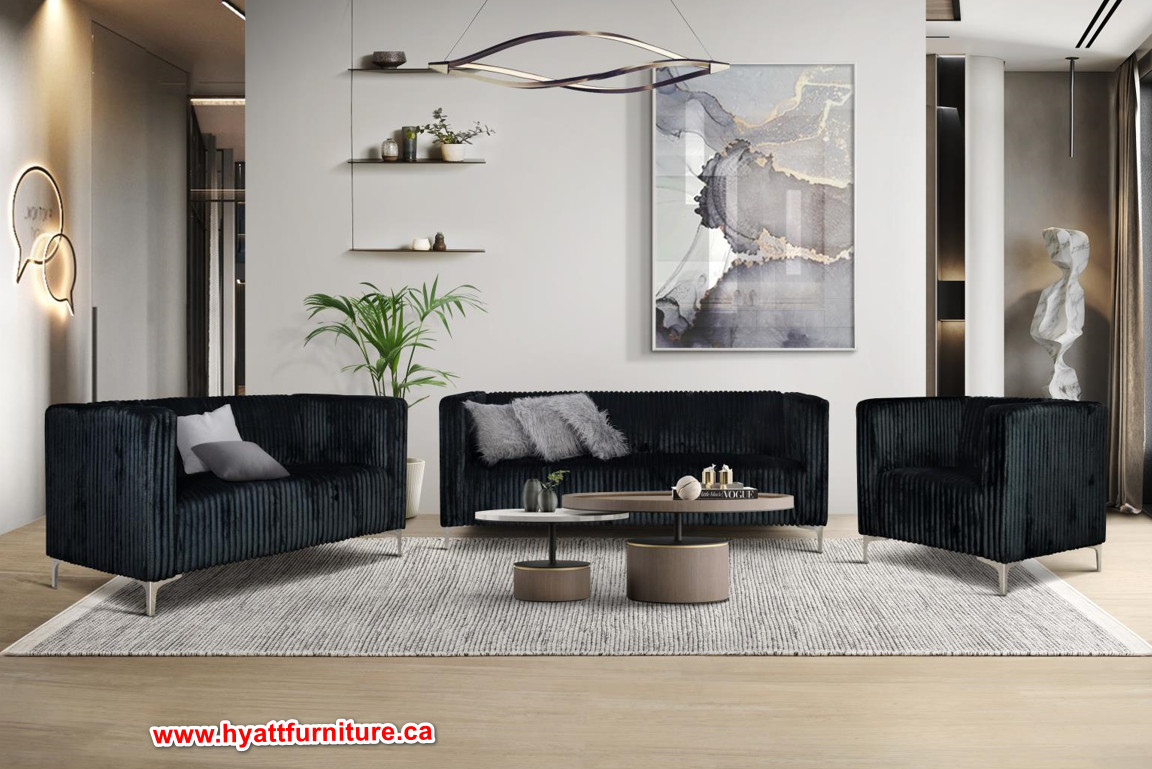 This modern sofa set is designed to impress. Black fabric.