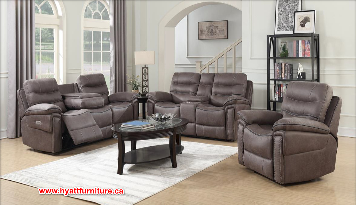 - Sofa with power recliners and power headrests, drop down tray with wireless charger and USB port;